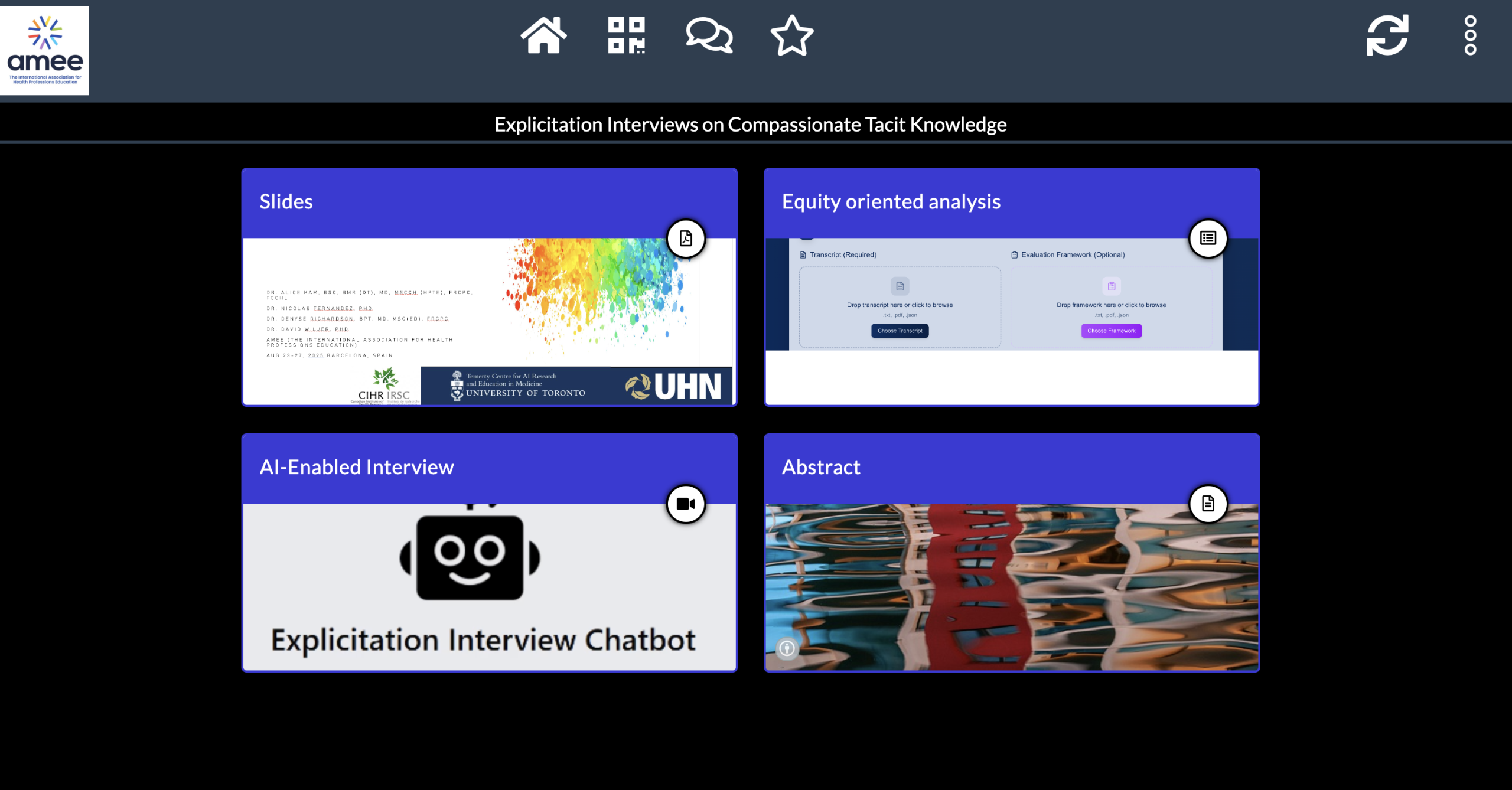 - Kam A, Fernandez N, Richardson D and Wiljer D. Explicitation interviews on compassionate tacit knowledge — A pilot study contrasting AI & human processes. MedEdPublish 2025, 15:185 (slides) (doi: 10.21955/mep.1115840.1)