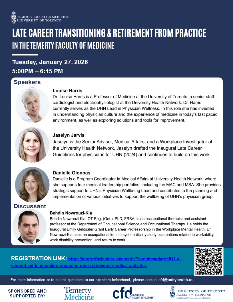 Finding the necessary information to access these opportunities can present a challenge and sometimes a disincentive. Medical Affairs at UHN set out to explore these “echo” career opportunities and suggestions with the intent of providing in- depth information as to how to access these. They will share with you specific suggestions for committee work and consulting, entrepreneurial choices, medical practice at home and abroad, as well as academic and CME teaching opportunities that are available. Our discussant, Dr. Behdin Nowrouzi-Kia, will provide insights from his recent paper, “Approaches to Enhancing and Sustaining Engagement in Post-Retirement Work: A scoping review”.
