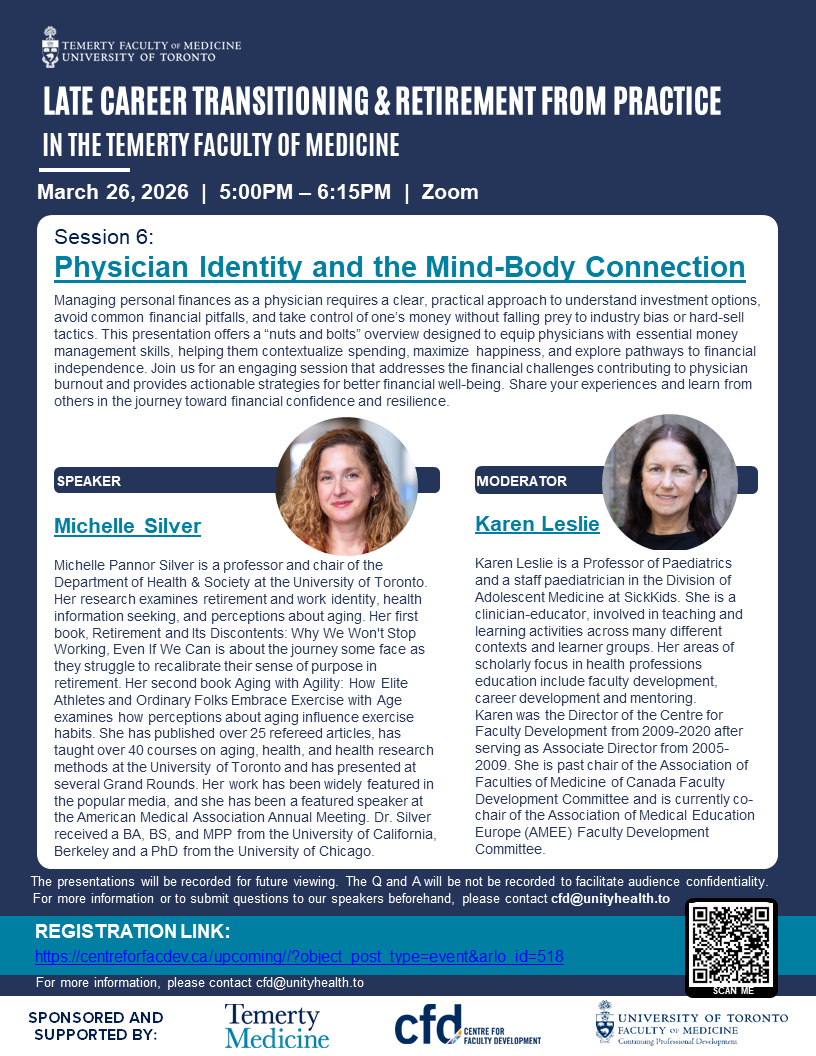 This interactive presentation will explore the challenges and opportunities of having a strong work identity and taking care of the body. For physicians, the relationship between work and personal life can have far-reaching implications for individuals and the healthcare system. Any form of transition for a physician is important for personal reasons; however, it can also have repercussions for patients, interrupting continuity in patient care, and affect members of allied healthcare teams. As more of us are living longer thinking about work identity and work transitions has become an increasingly relevant topic. Longevity also prompts the need to think more carefully and critically about how to keep aging bodies healthy. While evidence suggests that regular exercise is the most important modifiable factor that can increase the chances of aging with agility, some of us exercise enthusiastically and others of us avoid it like the plague. This talk will examine work identity in a way that is linked to exercise and somatic processes drawing from Michelle Pannor Silver, Ph.D.’s recent book Aging with Agility, and findings from Retirement and Its Discontents.